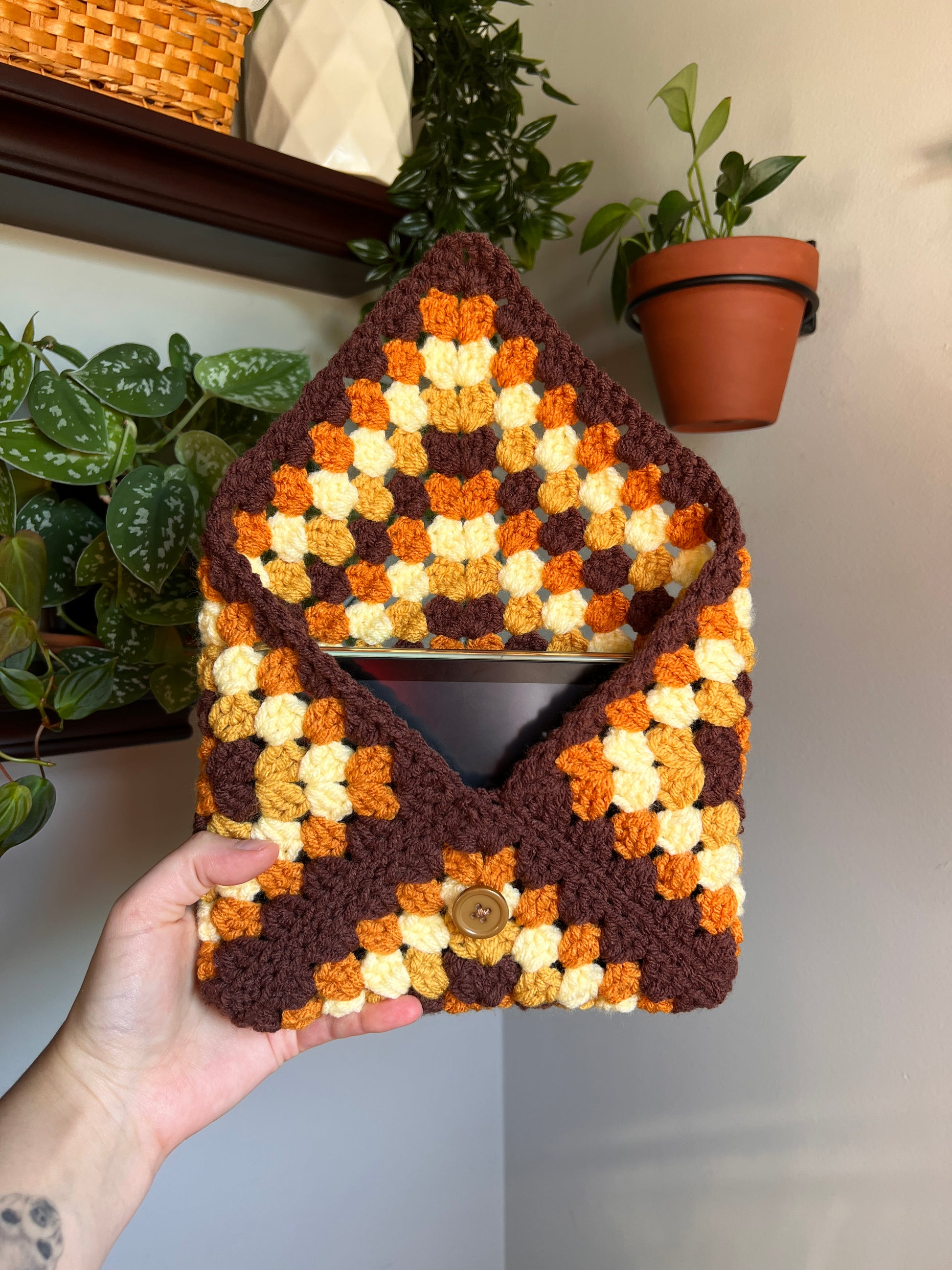 Protect your kindle, tablet or favorite book with this beautiful handmade retro inspired granny square crochet sleeve made in oranges, yellows and brown.